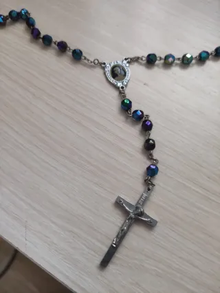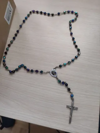 Elegante rosario con cuentas de cristal que reflejan tonos azules y morados. Incluye una medalla central de plata y cruz de plata - Diseño con cuentas facetadas. - Cadena metálica plateada.