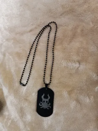 Collar con colgante metálico negro inspirado en Hollow Knight. El diseño del colgante es plateado y presenta un grabado. - Cadena de bolitas negra. - Cierre de mosquetón.