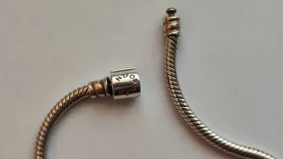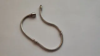 Pulsera de plata original de la marca Pandora, con una longitud de 20 cm. Cadena en diseño tipo serpiente. El cierre tiene forma de barril pero necesita reajustarse en tienda porque cierra flojito.