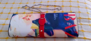 Bolso de mano tipo clutch con un diseño inspirado en una revista. - Estampado multicolor con detalles en rojo. - Cadena plateada para llevar al hombro. - Cierre con hebilla y correa roja.