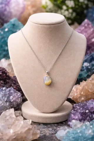 Collar con colgante de ágata loca. Se asocia con la alegría, el optimismo y la capacidad de absorber el dolor emocional. - Piedra natural con tonos amarillos y blancos. - Cadena plateada.