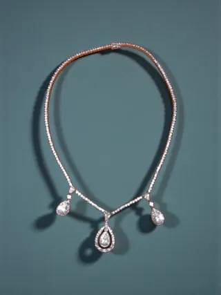 Elegante gargantilla con un diseño de joyería único. - Tres colgantes en forma de lágrima. - Cadena fina y delicada. - Acabado brillante. -engarzados en plata de ley. El collar que se muestra es un collar tipo tenis con colgantes en forma de lágrima. Se caracteriza por una cadena continua y simétrica de gemas engastadas individualmente y detalles colgantes adicionales. Detalles del Estilo Collar tipo tenis: La base es una cadena de eslabones articulados, cada uno engastado con una piedra, creando un patrón flexible y elegante. Colgantes en forma de lágrima: La pieza presenta tres colgantes distintivos con forma de pera o lágrima .