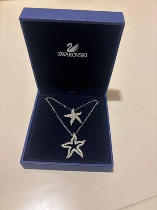 Elegante collar de la marca Swarovski con dos colgantes en forma de estrella. La cadena es de plata y los detalles de las estrellas están adornados con cristales brillantes. - Diseño de doble cadena. - Colgantes con forma de estrella. - Cristales brillantes.