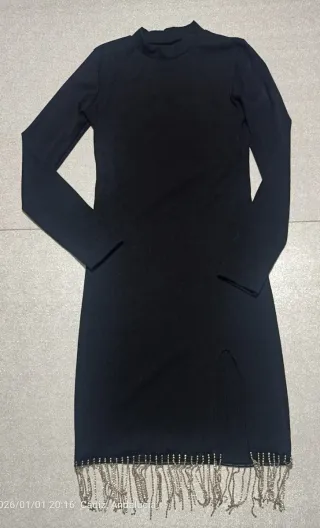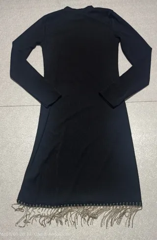 Elegante vestido negro con detalles de pedrería en el bajo. - Manga larga. - Diseño ajustado. - Adorno de cadenas plateadas en el dobladillo.