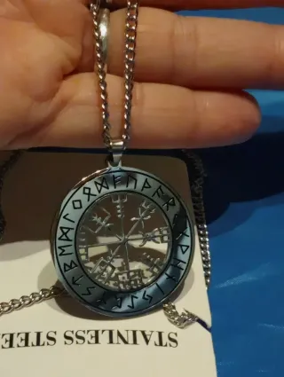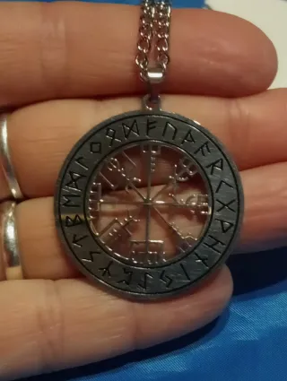 Brújula vikinga con diseño de Vegvísir, símbolo de guía y protección para el portador. - Fabricada en acero inoxidable de alta calidad. - Diseño intrincado con runas nórdicas. - Cadena de eslabones plateada.
