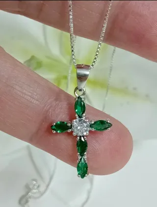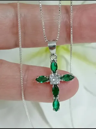 Preciosa cruz verde esmeraldas circonitas con cadena veneciana en plata de ley 925. El diseño es de alta calidad ,acabado y de una finura impecable. Medida de la cruz verde 17 mm x 12 mm y Cadena 40 cm largo. Lea bien las medidas.