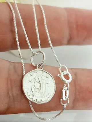 Elegante cadena de plata de ley 925 con colgante de la Virgen Niña. Un detalle delicado y significativo. - Material: Plata de ley 925. - Diseño: Colgante con imagen de la Virgen Niña. - Tipo de cadena: Caja.