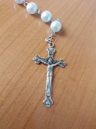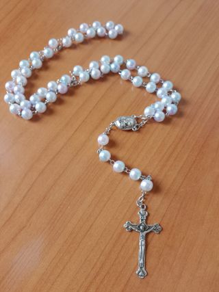 Hermoso rosario de plata con perlas, con un diseño inspirado en Jerusalén. Ideal para devoción. Detrás de la cruz está escrita la palabra JERUSALEM. Detrás de la virgen y el niño hay un compartimento donde hay tierra guardada y está escrito TERRA JERUSALEM. - Nuevo, a estrenar. - Cuentas de perlas. - Colgante con detalles. - Cadena de plata.