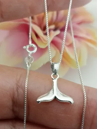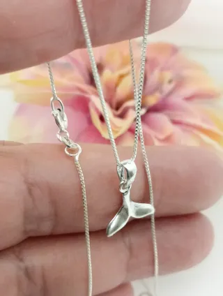 Preciosa cadena con colgante en forma de cola de ballena. Mide la cadena 40 cm de largo y 0.10 cm de grosor,la cola de ballena mide 0.90 cm de alto por 1.40 cm de ancho. - Material: Plata de ley 925. - Diseño: Cola de ballena. - Cadena: Tipo caja.