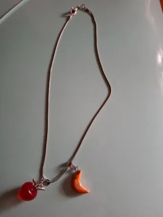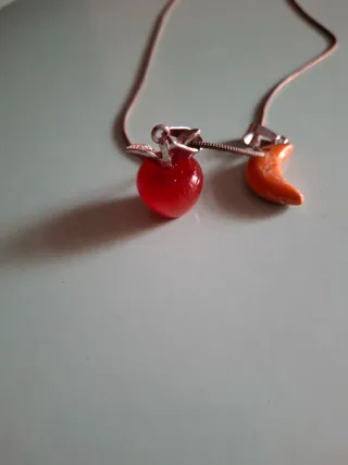 Collar con dos colgantes, uno con forma de manzana y otro de luna. - piedra natural - Colgante de manzana de ópalo rojo - Colgante de luna en jaspr naranja. - Cadena de plata.