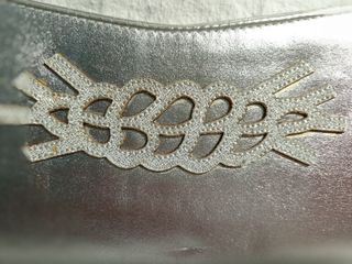 Bolso de fiesta color plateado con pedrería en la solapa. Tiene cadena para colgar. Liquidación tienda marroquinería familiar.