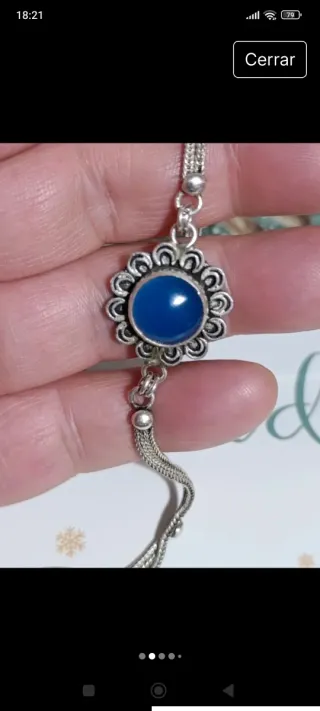 Elegante pulsera con un diseño floral y una piedra central de calcedonia azul. - Elaborada en Plata 925. - Detalle de flor con piedra azul. - Cadena fina y delicada.