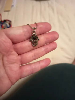 Colgante con diseño de la Mano de Fátima. - Cadena fina de plata. - Detalle de piedras negras en el centro.