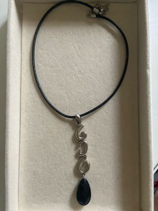 Elegante colgante con un diseño moderno y una piedra negra. - Colgante con detalles en espiral. - Piedra negra en forma de lágrima. - Cadena de cuero negra.