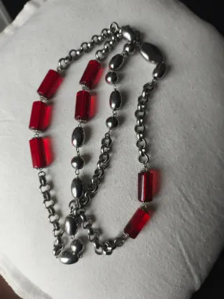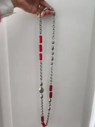 Elegante collar de 50cm con un diseño moderno. - Cadena de eslabones plateados. - Detalle de cuentas cilíndricas rojas. - Cuentas ovaladas plateadas.