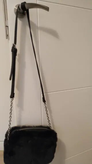 Bolso de peluche suave con un diseño moderno y cadena. - Material exterior de pelo sintético. - Cierre de cremallera. - Correa de cadena metálica plateada. - Medidas 22 × 18 cm.