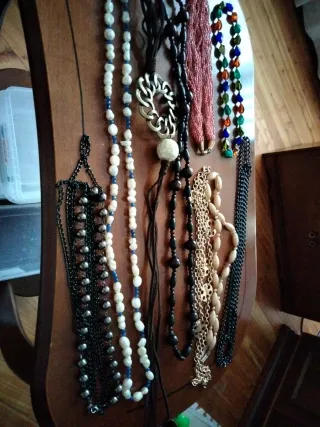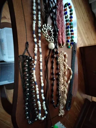 Conjunto de varios collares de diferentes estilos y materiales. Son 9 collares - Collares con cuentas blancas y detalles azules. - Collares con cuentas negras y doradas. - Collares con cuentas de colores variados. - Collares con cadenas doradas y plateadas.