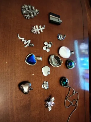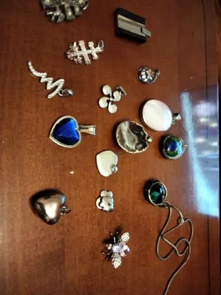 Conjunto de varios colgantes de plata con diferentes diseños.a 10 euros cada uno - Colgante con forma de corazón y piedra azul. - Colgante con forma de corazón liso. - Colgante con forma de abeja. - Colgante con forma de hoja. - Colgante con forma de pez. - Colgante con forma de espiral. - Colgante con forma de flor. - Colgante con piedra verde y cadena. - Colgante con piedra multicolor. - Colgante con piedra blanca. - Colgante con piedra gris y negra. - Colgante con piedra azul y verde.