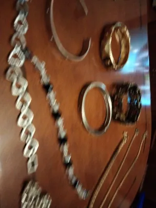 Conjunto de varias pulseras.a 8 euros cada una - Pulsera con eslabones en forma de corazón y detalles plateados. - Pulsera de cuentas transparentes y negras. - Brazalete rígido plateado con puntos. - Brazalete dorado con detalles. - Brazalete rígido plateado. - Brazalete negro con detalles. - Tres pulseras doradas de cadena.