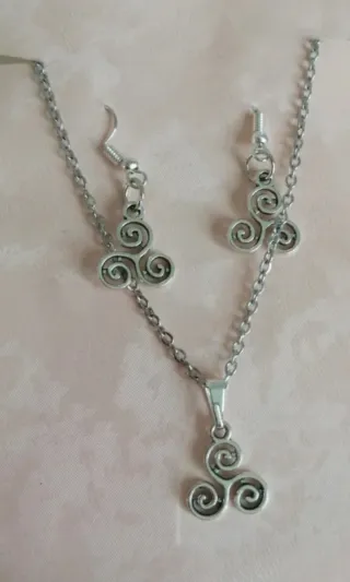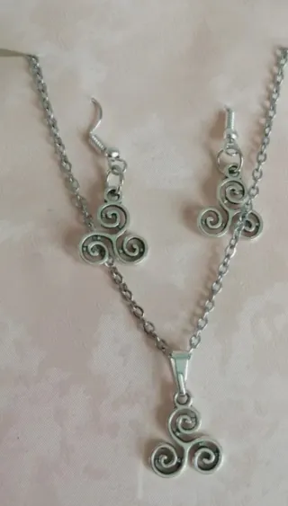 Conjunto con colgante y pendientes a juego, ambos con el símbolo del trisquel. - Diseño del trisquel en zamak con baño de plata. - Cadena de acero inoxidable. Lo puedo vender en conjunto o por separado