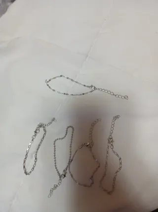 Conjunto de cinco pulseras plateadas con diferentes diseños. - Pulsera de cadena fina. - Pulsera de eslabones rectangulares. - Pulsera de bolitas. - Pulsera con detalles. - Cierre ajustable.