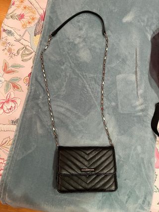 Elegante bolso negro con diseño acolchado y detalle de cadena. en perfecto estado aunque un poco deshilachado - Acabado en piel sintética. - Cierre de solapa. - Cadena metálica plateada.