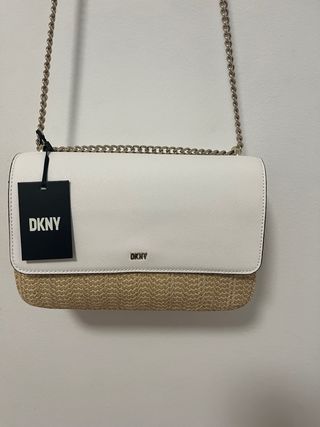 Elegante bolso DKNY con un diseño bicolor. - Parte superior en blanco texturizado. - Base en material de rafia beige. - Cadena metálica plateada para llevar al hombro o cruzado. - Detalle del logo DKNY en la parte frontal.