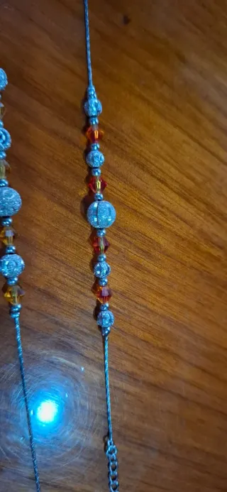 Bonitas pulseras con un diseño delicado y adornos brillantes. - Cuentas de cristal en tonos ámbar y naranja. - Elementos metálicos plateados con textura. - Cadena ajustable para un ajuste perfecto.