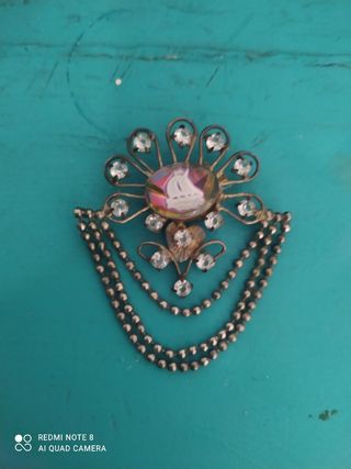 Precioso broche antiguo con detalles en plata. Es una pieza única y llamativa. - Diseño floral con cristales. - Colgante con cadena de bolitas. - Incluye un elemento central con forma de barco.