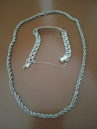 Preciosa gargantilla y pulsera de plata de ley 925. Son dos piezas elegantes y delicadas, perfectas para cualquier ocasión. - Material: Plata de ley 925. - Incluye una gargantilla y una pulsera. - Diseño de cadena fina y brillante.