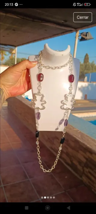 Collar largo con colgantes de ositos y cuentas de cristal morado y transparente. - Diseño con dos ositos plateados. - Combinación de cuentas moradas y transparentes. - Cadena de eslabones plateados. - Acero - Nuevo con su etiqueta