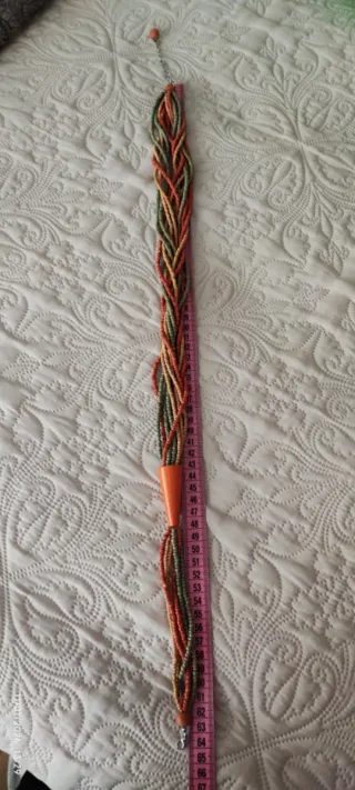 Collar de cuentas y madera con un diseño trenzado y un colgante cónico. Cuentas en tonos verdes, naranjas y ocres. Cierre de mosquetón plateado. Colgante cónico de madera naranja. Medidas abierto 64 cm más 7 cm de cadena de extensión.