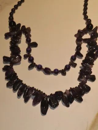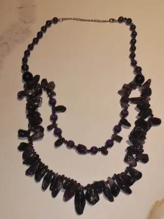 Elegante collar de bisutería con piedras en tonos lila y detalles plateados. - Diseño de dos hileras. - Piedras irregulares y cuentas redondas. - Cierre de cadena.