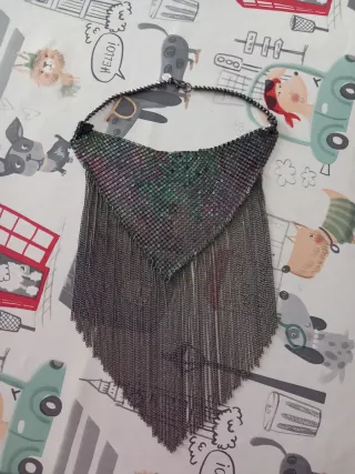 Espectacular collar de estética retro de los años 70 o estilo boho-chic. tipo pechera / bandana, con diseño en forma de triángulo y flecos de cadena largos. Fabricado con una malla metálica "liquid mesh" que presenta un acabado tornasolado o multicolor sobre un tono base oscuro, tipo plata oxidada.legante collar plateado con un diseño de malla y múltiples flecos largos.