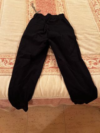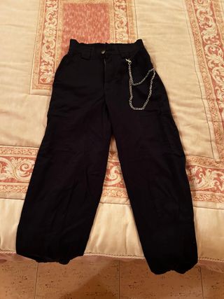 Pantalones de estilo cargo en color negro, con un diseño moderno y detalles únicos. - Cintura elástica. - Bolsillos laterales. - Cadena decorativa plateada.