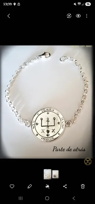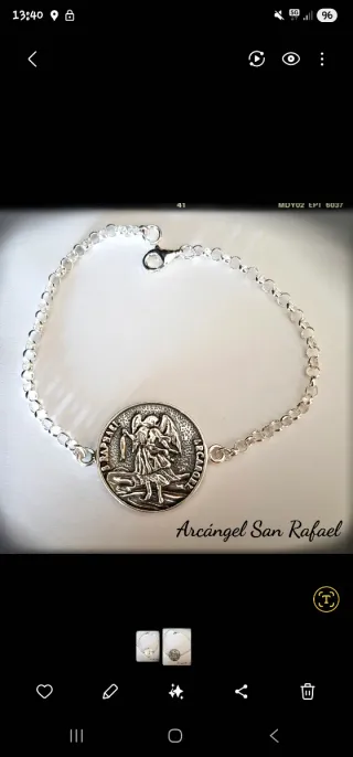 Pulsera de plata de ley con un diseño del Arcángel San Rafael reversible. - Diseño detallado de la medalla de 2,2 cms del Arcángel San Rafael, y sello de invocaciòn del Arcangel - Cadena de eslabones tipo.ropo de unoa 18 cms - Cierre de mosquetón. Tenemos disponibles San Miguel y San Gabriel