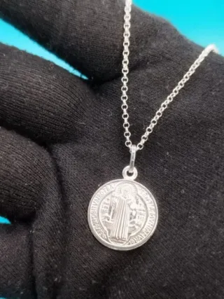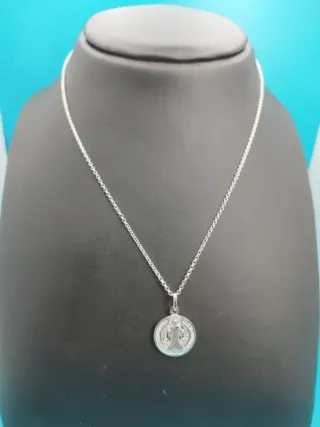 Preciosa medalla de San Benito en plata de ley 925. Diámetro de la medalla 1,75 cm. Incluye cadena Modelo rolo Diamantada de 45 cm. Peso 6 gr. No baño. Precio no negociable.