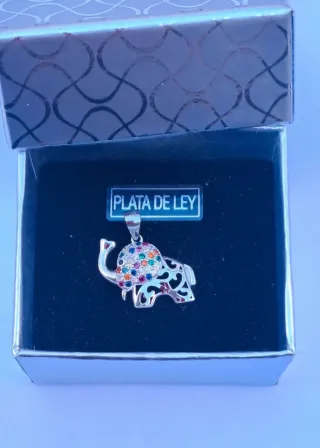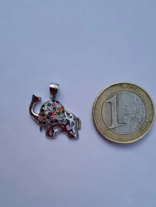 Este colgante tiene la forma de un elefante con detalles calados y adornado con pequeñas piedras de colores. - Diseño de elefante. - Piedras de colores. - Cierre para cadena.