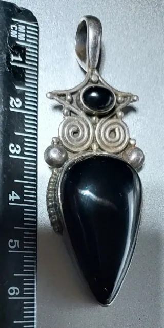 Elegante colgante antiguo con detalles en plata y dos piedras de ónix negro. - Diseño con motivos en espiral. - Incluye una piedra corazón de ónix negro y otra pequeña ovalada. - Cierre para cadena. - Punzones plata 800 y otros. Gracias.