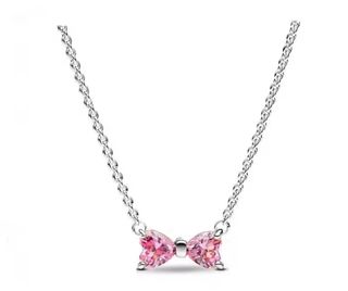 Delicado collar con un charm en forma de lazo adornado con piedras rosas. La cadena es de plata. - Diseño de lazo. - Piedras de color rosa.