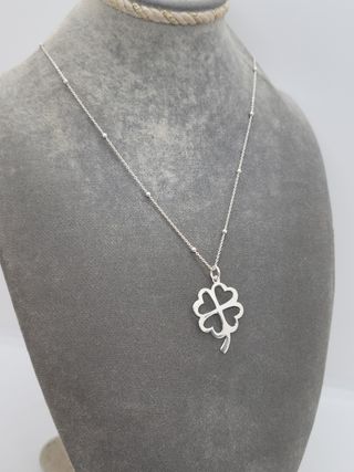 Preciosa cadena con colgante de trébol de plata de ley. Incluye la cadena. Es un diseño elegante y delicado, perfecto para cualquier ocasión. - Colgante con forma de trébol de cuatro hojas. - Cadena de plata incluida. - Material: Plata de ley 925. - Cierre de mosquetón.