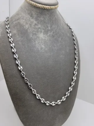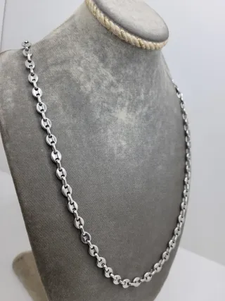 Elegante cadena con eslabones tipo granos de café. - Acero quirúrgico. - Diseño de calabrotes. - Acabado plateado brillante.