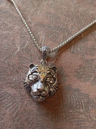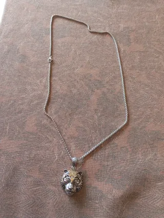 Colgante con un detallado diseño de cabeza de tigre. - Cadena de eslabones finos. - Colgante con acabado plateado y detalles dorados.