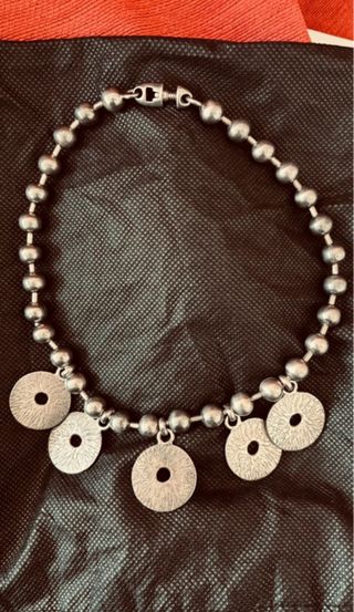 Collar de la marca Ciclón con un diseño plateado. - Cadena con cuentas. - Colgantes circulares con diseño texturizado y agujero central.