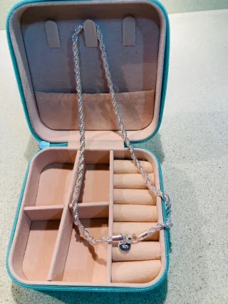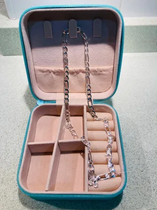 Elegante cadena de plata con un práctico joyero de viaje. Estupendo para 🎁 ❤️ - Cadena de plata con un diseño intrincado. - Joyero de color azul para guardar tus accesorios.