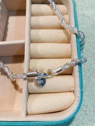 Elegante cadena de plata de 40cm con un diseño trenzado y un pequeño colgante con la marca 925. Incluye un joyero para guardarla. Ideal para 🎁 - Material: Plata 925. - Diseño de cadena: Trenzado. - Incluye: Cadena y joyero.