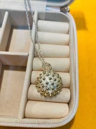 Conjunto de colgante con cadena y un joyero de viaje. Precioso para regalo - Colgante con diseño esférico y detalles. - Cadena de eslabones finos. - Joyero forrado en tela.