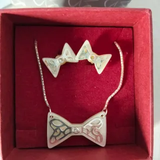 Elegante conjunto de joyería con diseño de lazo. - Collar con cadena de plata. - Pendientes a juego con diseño de lazo. - Detalle de circonita en el centro del collar.