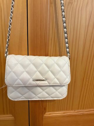 Bolso blanco con diseño acolchado y detalle de cadena. - Cierre de solapa. - Cadena metálica plateada. - Diseño acolchado en rombos.
