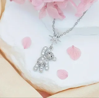 Elegante collar con un delicado colgante. Diseño: - Diseño de osito con detalles brillantes. - Adornado con una estrella. - Cadena fina y plateada. Detalles: Material: Acero inoxidable ✨️ Color: Plateado 🥈